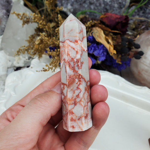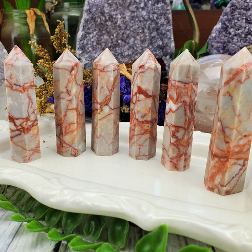 Our Red Banded Calcite Towers, also called Pork Stone, are sold as randomly selected single pieces. They are approximately 3 3/4" long. They are fu...