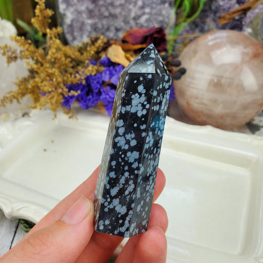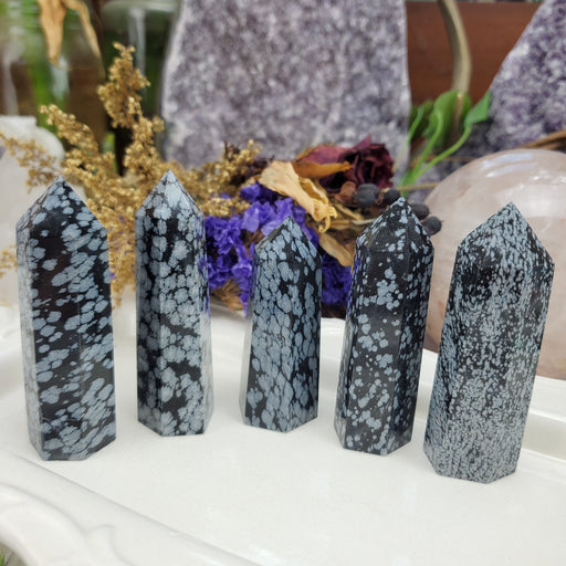 Our Snowflake Obsidian Towers are sold as randomly selected single pieces. They are approximately 2 3/4" - 3" long. They are fully polished with wi...