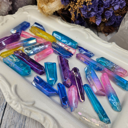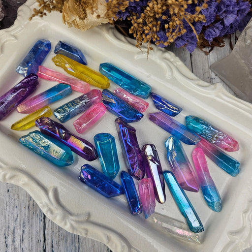 Like delectable candies, these Aura Quartz Points shine with brilliant, fun, color! They're lightly tumble polished Quartz that have been made colo...