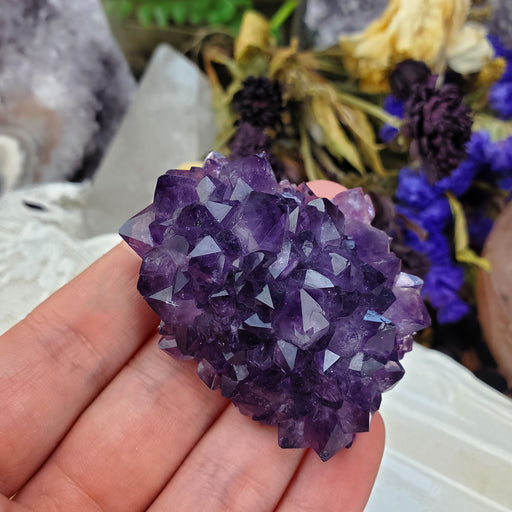 This Uruguay Amethyst Stalactite Rose is approximately 2 1/4" wide 1" thick. It has a flat polished bottom. Click here to see all Amethyst Roses