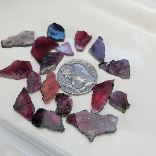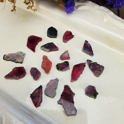 This lot of Tourmaline is made up of bits and pieces that are still beautiful but, they're incomplete slices. These odd shapes will make really uni...