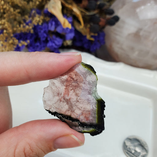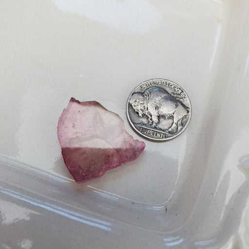 This Tourmaline has soft pink hues. This Tourmaline Slice is approximately 1 1/8'' long and 1" wide. Click here to see all Tourmaline