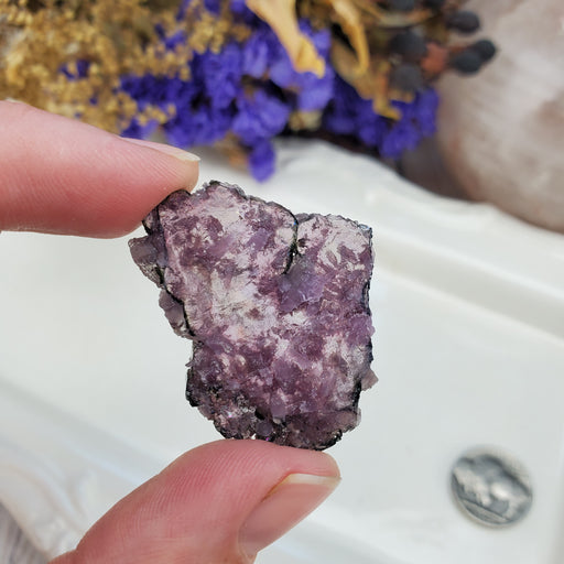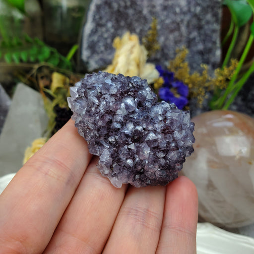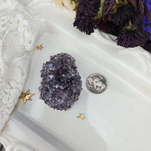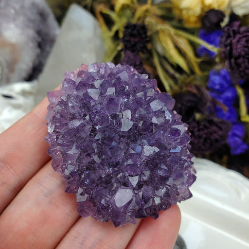 This Uruguay Amethyst Stalactite Rose is approximately 2 1/4" wide 1" thick. It has a flat polished bottom. Click here to see all Amethyst Roses