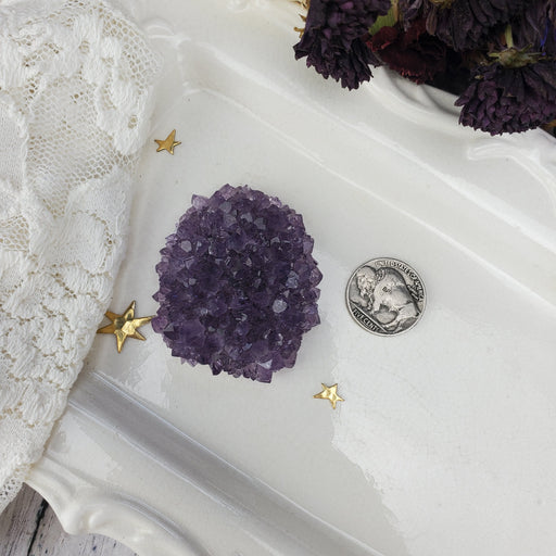 This Uruguay Amethyst Stalactite Rose is approximately 2 1/4" wide 3/4" thick. It has a flat polished bottom. Click here to see all Amethyst Roses