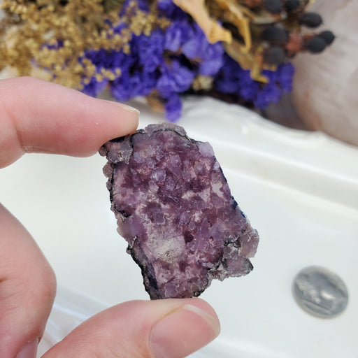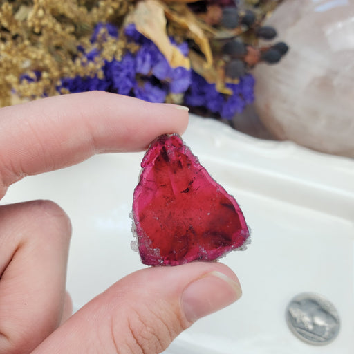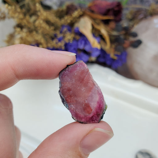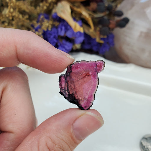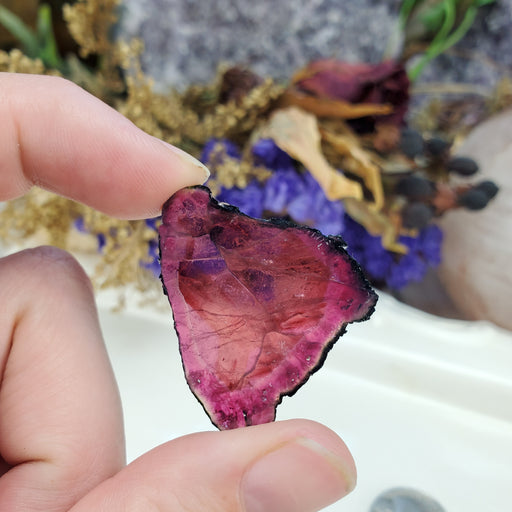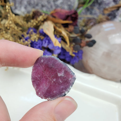 These deep purple slices of Tourmaline are full of glittering Lepidolite inclusion. Our Tourmaline with Lepidolite Slices are sold as randomly sele...