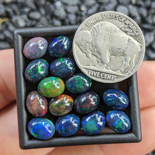 Our ~6x8mm Oval Welo Smoked Black Opal Cabochons are hand cut and polished from Ethiopian Opal that has been 'smoked', a process that darkens the o...