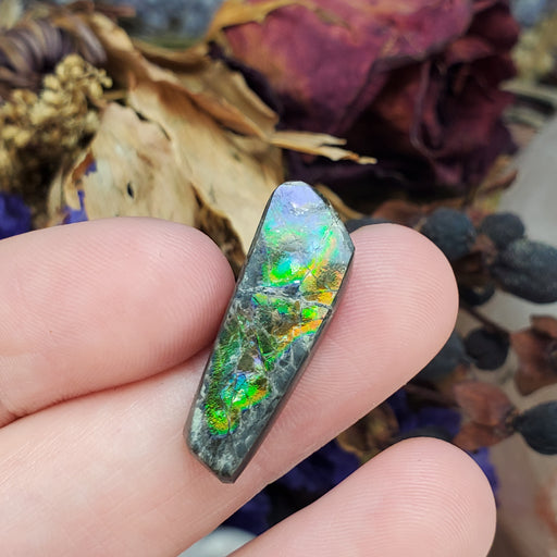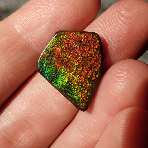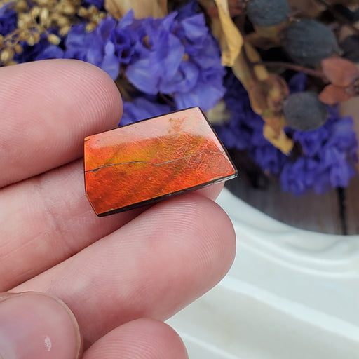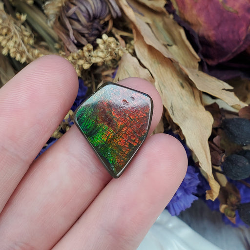 This brilliant Ammolite Cabochon glows with a warm red tone over green. This Ammolite Cabochon is approximately 11mm wide and 20mm tall. It is fla...