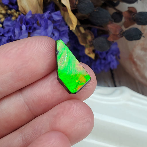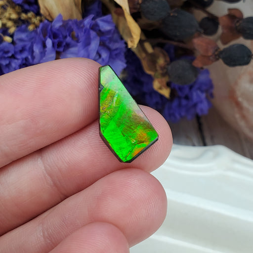 This brilliant Ammolite Cabochon is a vibrant and glowing green! This Ammolite Cabochon is approximately 9mm wide and 18mm tall. It is flat backed...