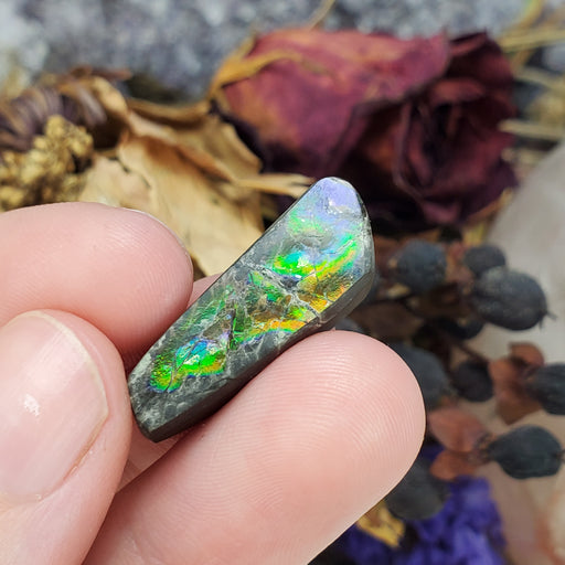 This brilliant Ammolite Cabochon has a lovely display of color, shifting from blue to green, yellow and red. This Ammolite Cabochon is approximate...