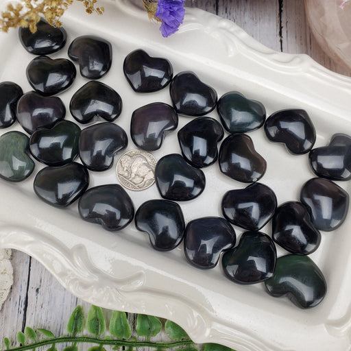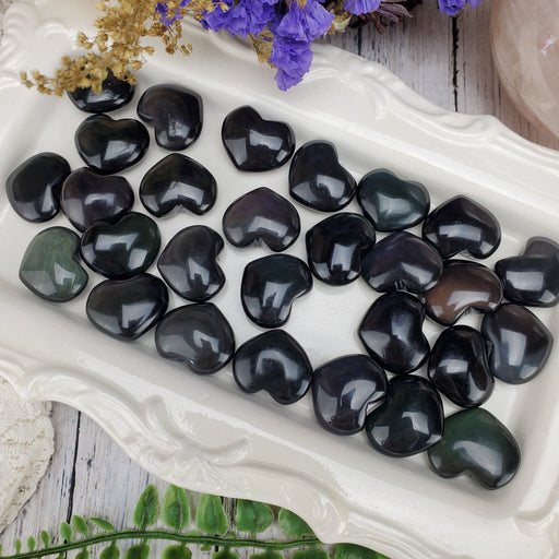 These Rainbow Obsidian Hearts are beautifully black with sneaking rainbows! Their bands of swirling soft pastel rainbows shine when moved in the li...