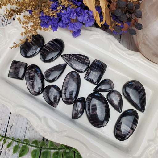 These Silver Sheen Obsidian are deep and dusky, they set a scene of fog setting over darkness. Our Silver Sheen Rose Cut Cabochons are sold as ran...
