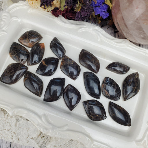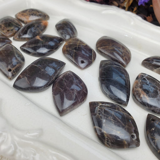 These dusky Black Moonstone Cabochons are drilled for easy jewelry making! These pieces have beautiful dark color and veining, many with sneaking s...