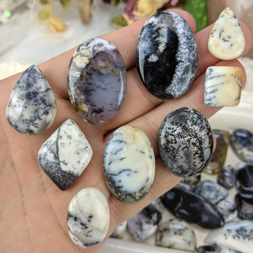 These snowy white Dendritic Opals are broken by chaotic black dendrites. Our Dendritic Opals are sold as randomly selected single piece. They rang...