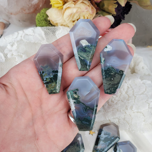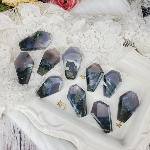 View full detailsMoss Agate Coffin Cabochons, blue/grey
