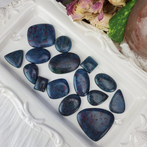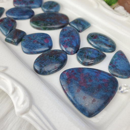Beautiful blue and green Kyanite slightly shimmer, while blooms of ruby emerge from below blue waters. Our Ruby in Kyanite Cabochons are sold as r...