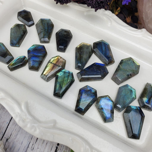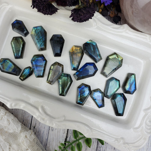 These Labradorite Coffin Cabochons are excellent quality, full of fire and flash! Our Labradorite Coffins are sold as randomly selected single pie...