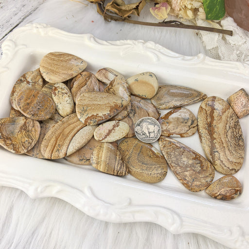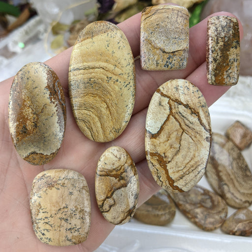 Our Picture Jasper Cabochons are sold as randomly selected 100g bags. Each bag contains between 8 - 12pcs. The cabochons are roughly 1" - 2 1/2". ...