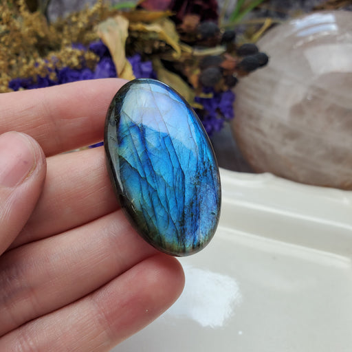 This Blue Cabochon is approximately 1 3/4" long and 1" wide. It is flat backed. Click here to see all Blue Labradorite
