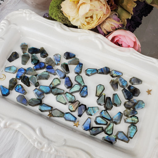 These Labradorite Coffin Cabochons are excellent quality, full of fire and flash! Our Labradorite Coffins are sold as randomly selected single pie...