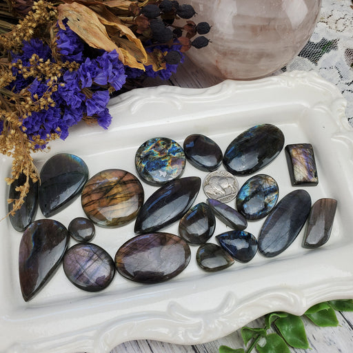 Our Labradorite Cabochons are hand cut and polished from all natural Multi Color Labradorite. These Labradorite Cabochons are sold as randomly sel...