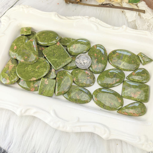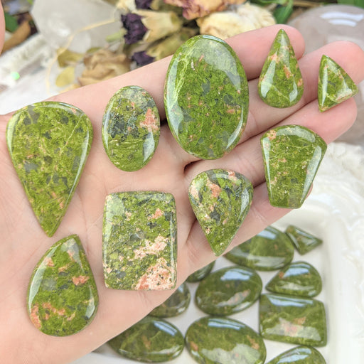 Our Unakite Cabochons are sold as randomly selected 100g bags. Each bag contains between 8 - 15pcs. The cabochons are roughly 3/4" - 2". They are ...