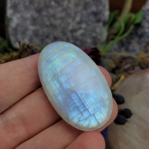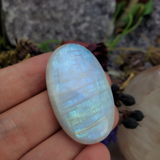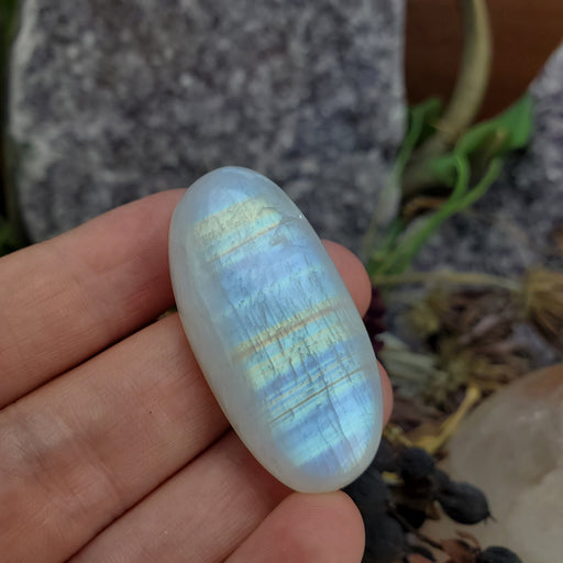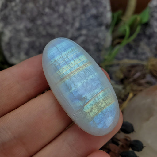 This Rainbow Moonstone Cabochon is approximately 1 3/4" long and 7/8" at the widest. Click here to see all Moonstone