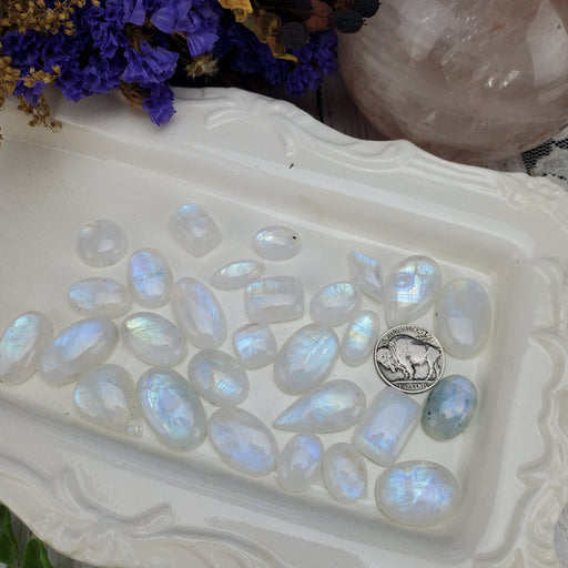 These gorgeous Rainbow Moonstone Cabochons have gorgeous flash and color! This Moonstone Cabochon Set contains 6 pieces. They range in size from a...