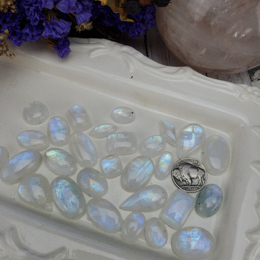 This listing is for 1/4 kilo lot of Moonstone Cabochons. The 1/4 kilo has roughly 75- 80 pieces. Click here to see all Moonstone