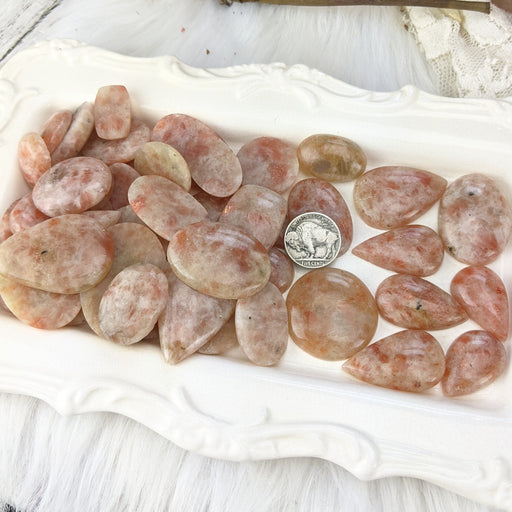 Warm and sunny, these Cabochons sparkle with brilliant rays of shimmering orange sun spots. Our Sunstone Cabochons are sold as randomly selected s...