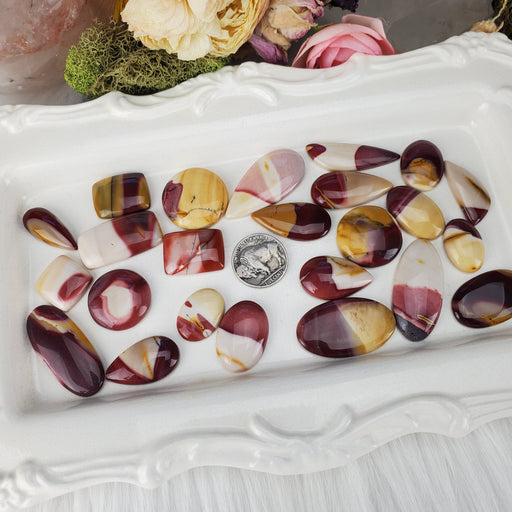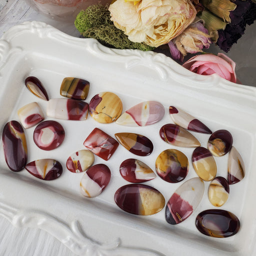Like the colors found in mid-autumn, these Mookaite Cabochons shift from blushed red to golden yellow. Our Mookaite Cabochons are sold as randomly...