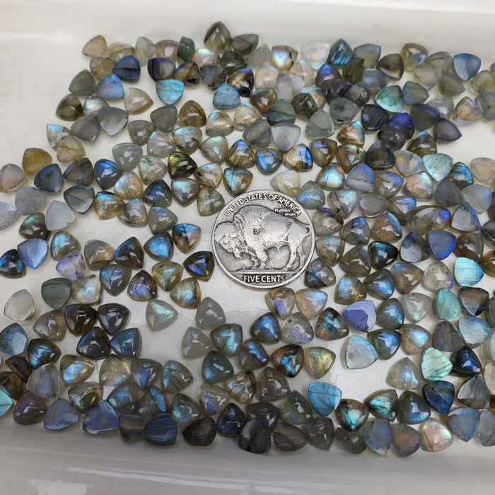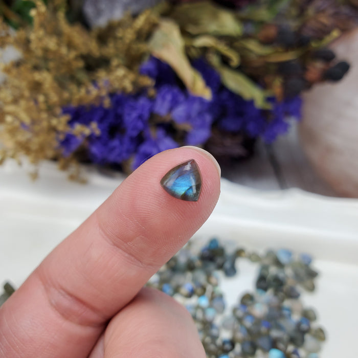 These Labradorite Trillion Cabochons are sold as randomly selected single pieces. They are approximately 6mm wide triangles.