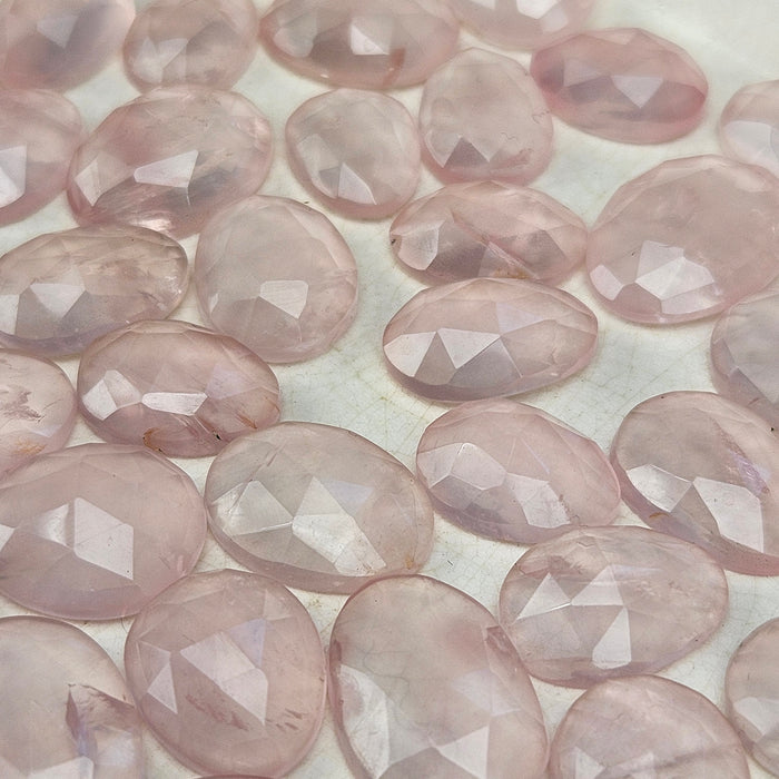 Our Rose Quartz Rose Cut Cabochons are sold as randomly selected single pieces. They range from approximately 10mm wide - 15mm long, and roughly 4mm thick. They are flat backed with facets tops.