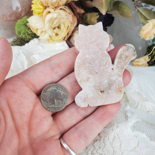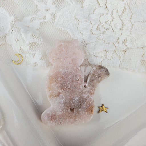 This Pink Amethyst Cat is a gorgeous pink-peach color and full of glittering druzy! It would make a cute statement piece or look purrect on display...