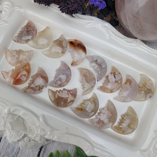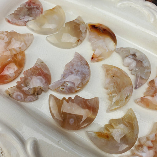 Flower Agate makes the most romantic moon, with lacey plumes of white agate, brilliant streaks of color, and soft creams that fade into grey. Our ...