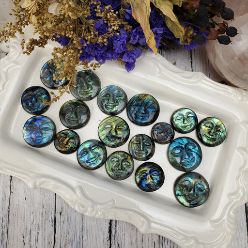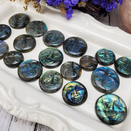 These quirky round Labradorite Faces would make the most beautiful moons and brilliant suns! Each cabochon has wonderful, full face, flash. Our La...