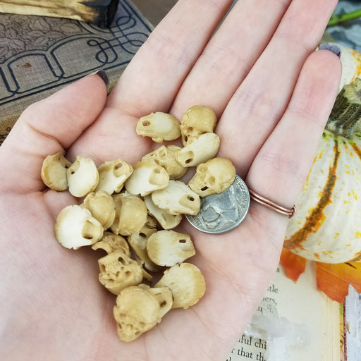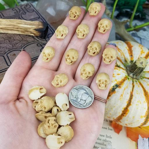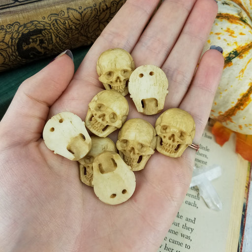 Our Mini Skulls Cabochons are hand carved and polished from all natural Cow and/or Buffalo Bone. They are drilled for easy jewelry making on the ba...