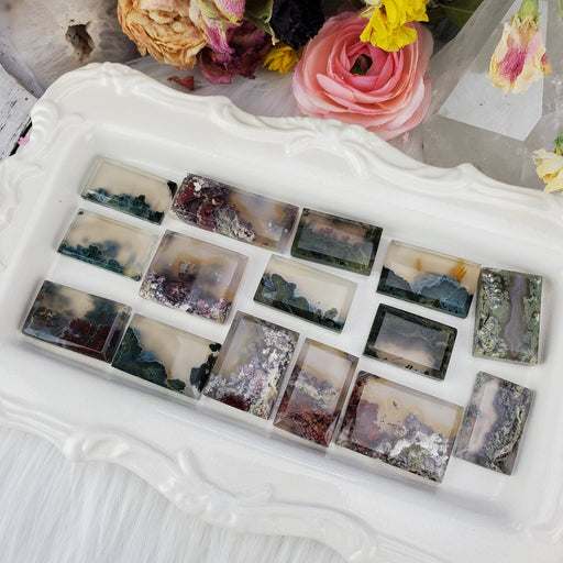 Like enchanted forests and lost lakes, these gorgeous Moss Agate Cabochons are perfect snapshots of mystical gardens. Our Moss Agate Rectangle Cabo...