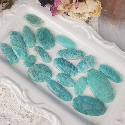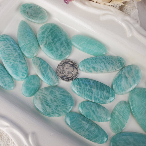 Our Amazonite Oval Cabochons are hand cut and polished from all natural Amazonite. These pieces are my favorite shade of ocean. The brilliant blue-...