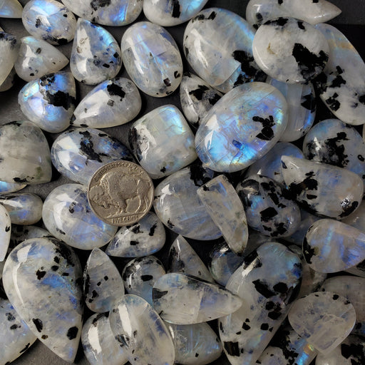 Our Moonstone with Black Tourmaline Cabochons are hand cut and polished from all natural Rainbow Flash Moonstone with natural Black Tourmaline incl...