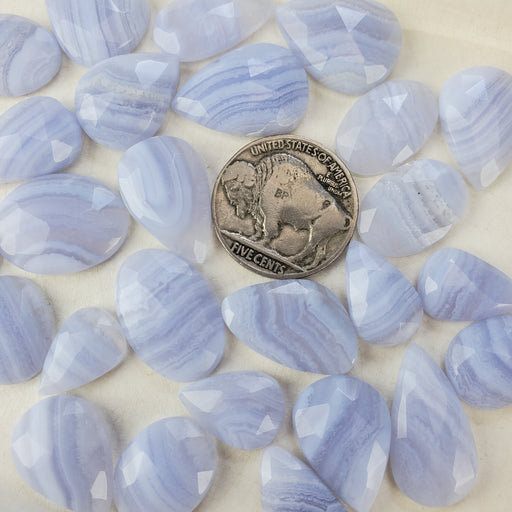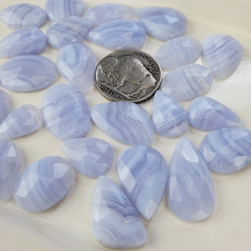 These Blue Lace Agate Rose Cut Cabochons are soft, with winding bands of deeper blue. Our Blue Lace Agate Cabochons are sold as randomly selected...