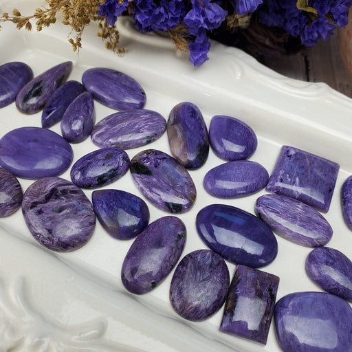 These Charoite Cabochons are pleasantly purple. These Charoite Cabochons are sold as randomly selected single pieces. They range from approximatel...