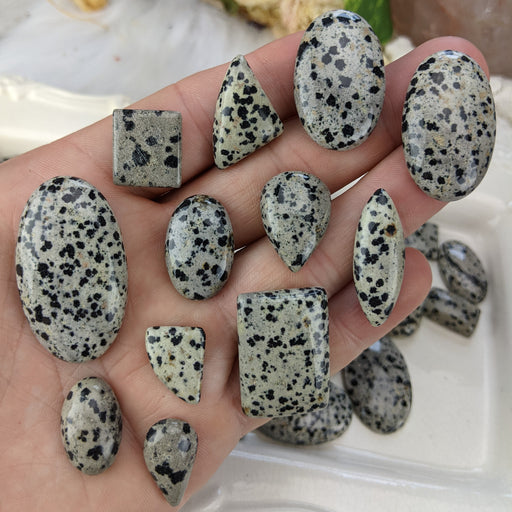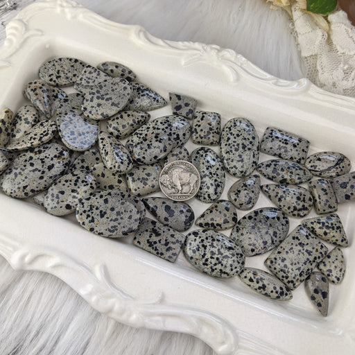 These spotted Dalmatian Jasper cabochons are surprisingly fun and beautiful! Sneaky flecks of orange-gold hide alongside the black spots! Our Dalm...