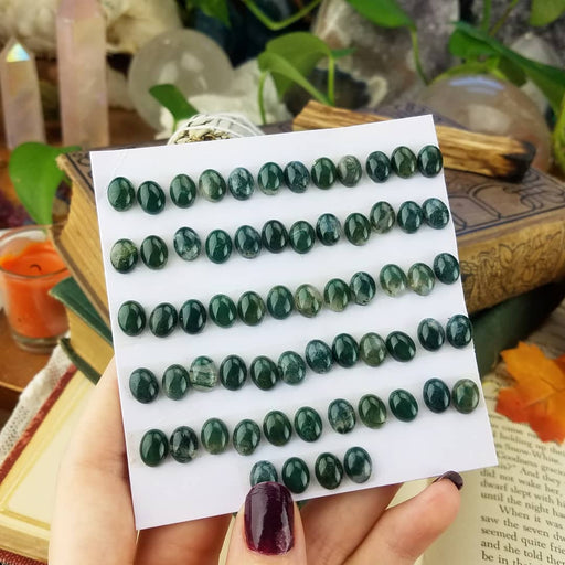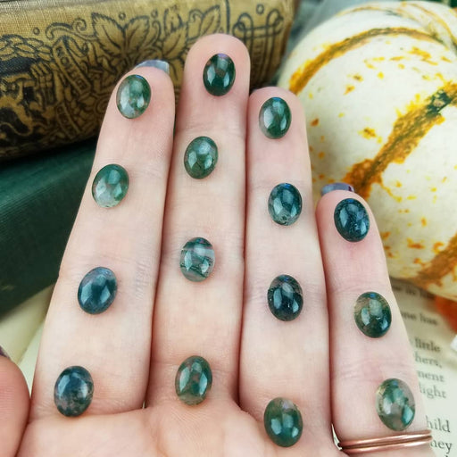Our Moss Agate 7x9mm Oval Cabochons are hand cut and polished from all natural Moss Agate. Reminiscent of an Enchanted Forest, these cabochons boas...