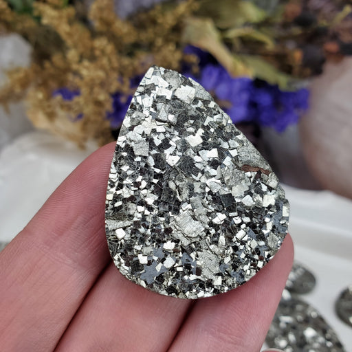 These Druzy Pyrite Cabochons are like palm sized disco balls! Their cubic crystal faces catch and throw light in a dazzling way, shining from every...