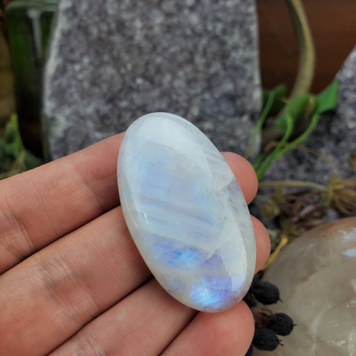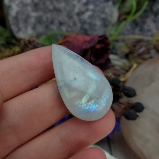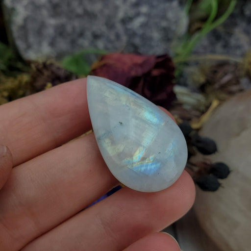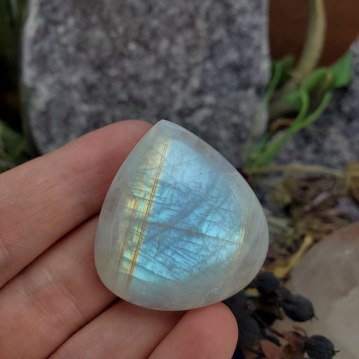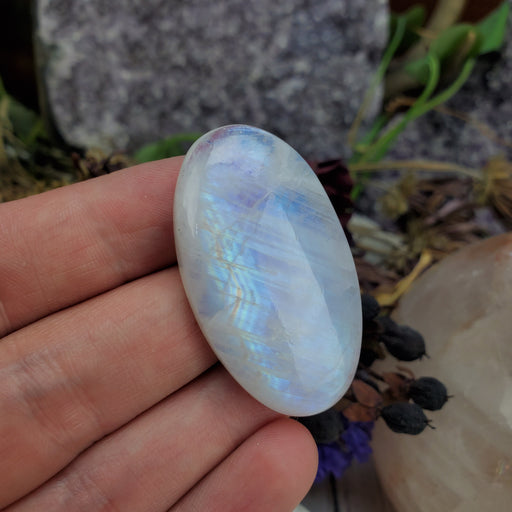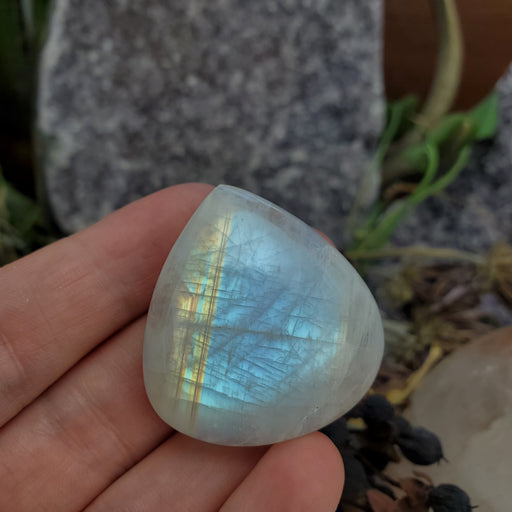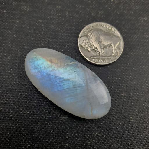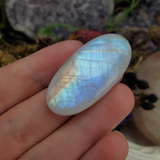 This Rainbow Moonstone Cabochon is approximately 1 3/4" long and 7/8" at the widest. Click here to see all Moonstone