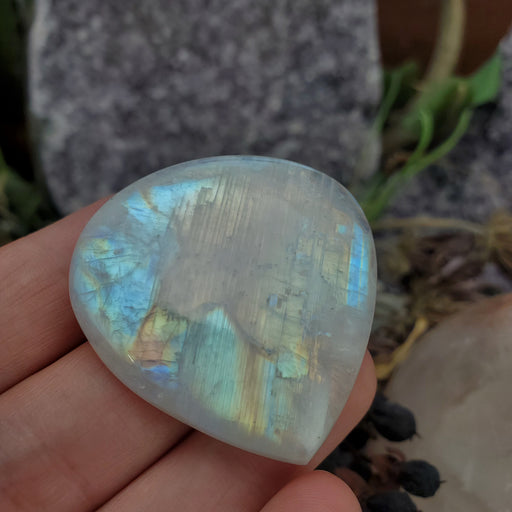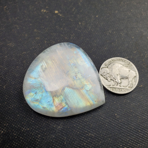 This Rainbow Moonstone Cabochon is approximately 1 3/4" long and 1 5/8" at the widest. Click here to see all Moonstone