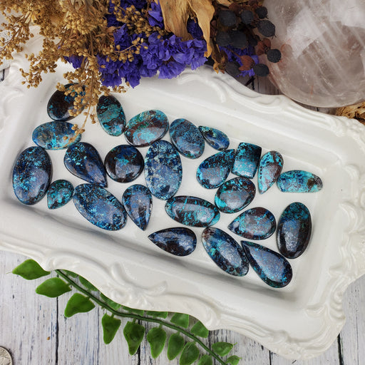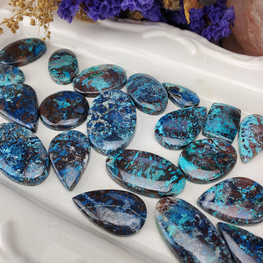 These brilliant blue Shattuckite Cabochons are wonderfully vivid, with beautiful patterns of veining quartz and mineral. Our Shattuckite Cabochons...