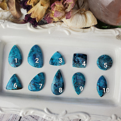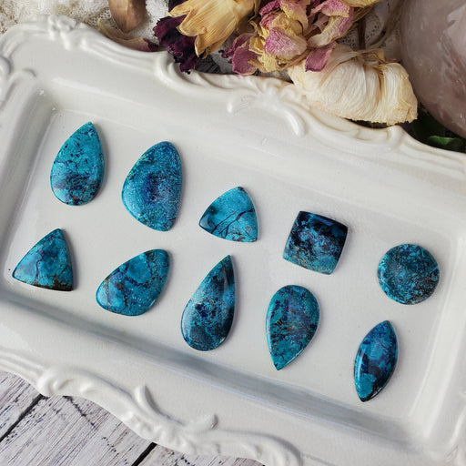 These brilliant blue Shattuckite Cabochons are wonderfully vivid, with beautiful patterns of veining quartz and mineral. These Shattuckite Cabocho...