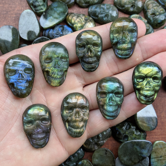 These Labradorite Skull Carving Cabochons are sold as randomly selected single pieces. They range from roughly 3/4x1 1/8", are roughly 1/4" thick and are uneven on top with a flat bottom.