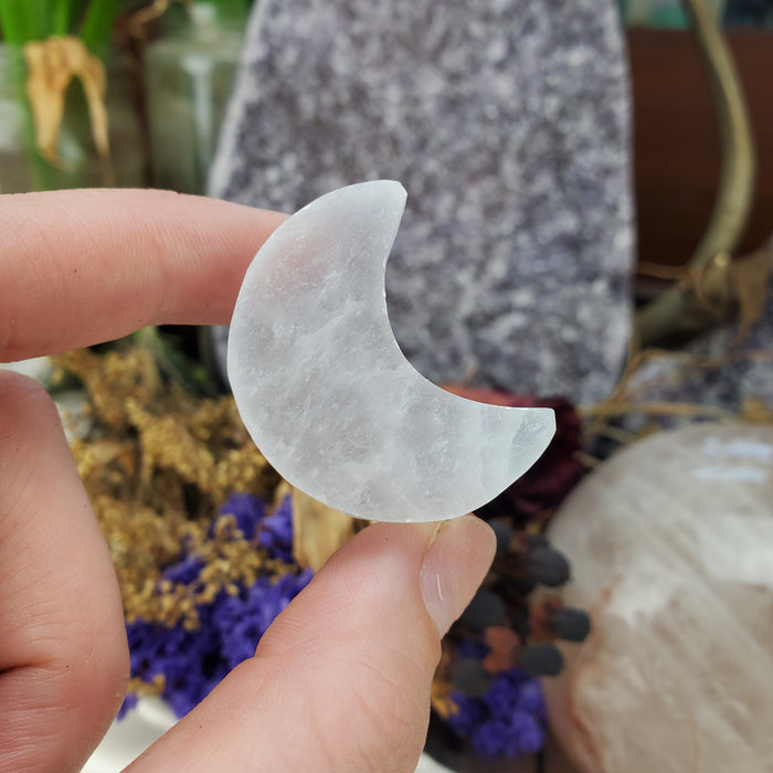 These Selenite Moons are sold as randomly selected single pieces. They range from approximately 1 ¼" tall, ⅝" wide, and ⅜" thick.